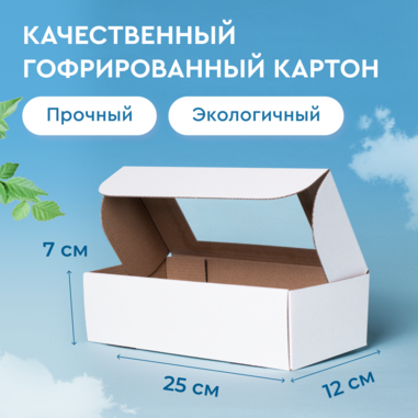 Коробка изготовлена из плотного белого гофрокартона Марки Е, легко и быстро собирается без применения скотча и клея. В крышке коробки есть окно с прозрачным пластиком. Можно использовать для упаковки любого товара для отправки транспортной компанией. Отлично подходит для упаковки подарка: благодаря прозрачному окошку содержимое будет выглядеть презентабельно.